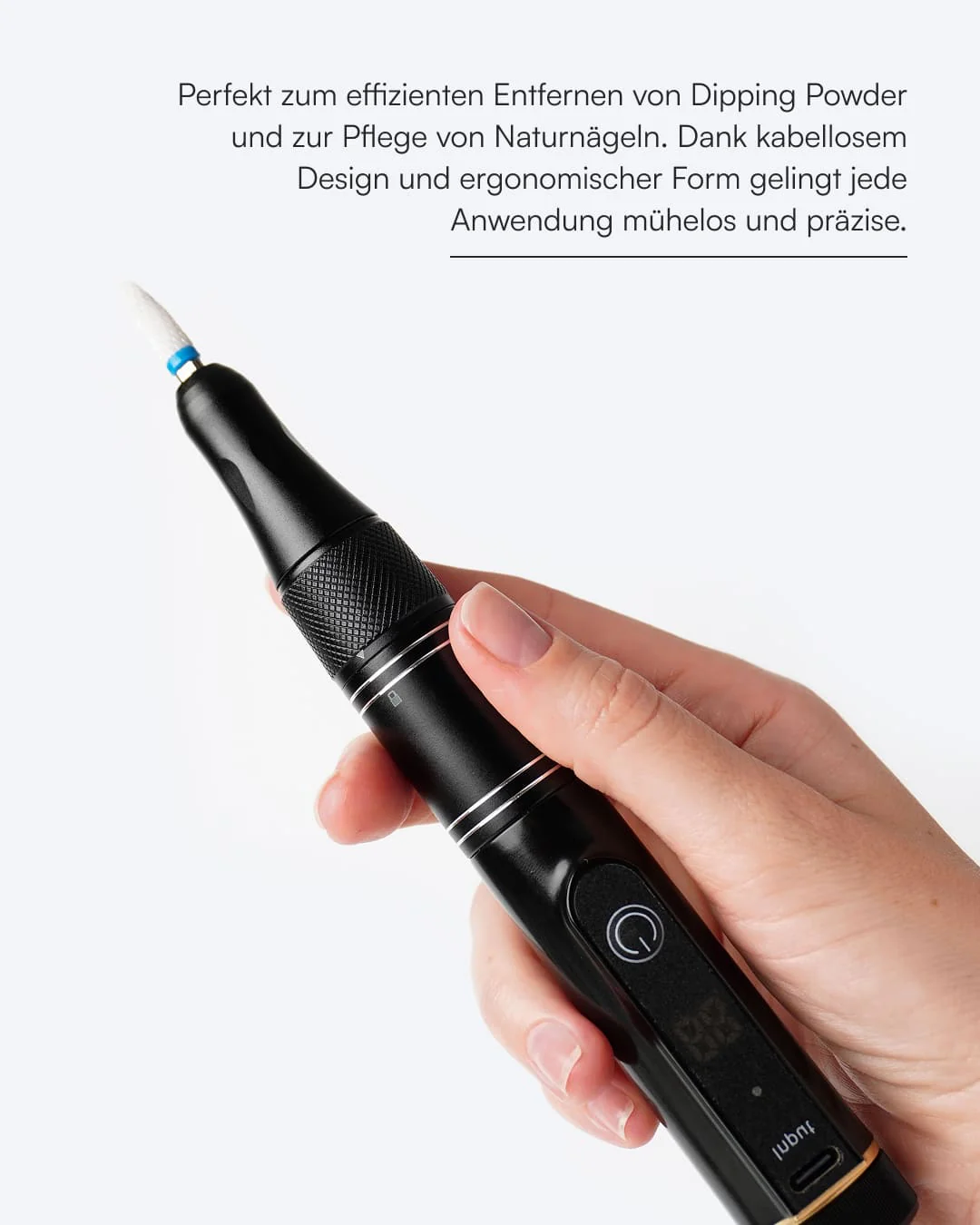 Der mitgelieferte Keramik-Bit in Birnenform eignet sich ideal zum Entfernen von Dipping Powder Farbschichten und macht den Einstieg besonders leicht. Ein integrierter Auto-Stopp schützt das Gerät zuverlässig vor Überlastung. Dabei arbeitet der Fräser angenehm leise (< 45 dB) und erzeugt nur minimale Wärme.