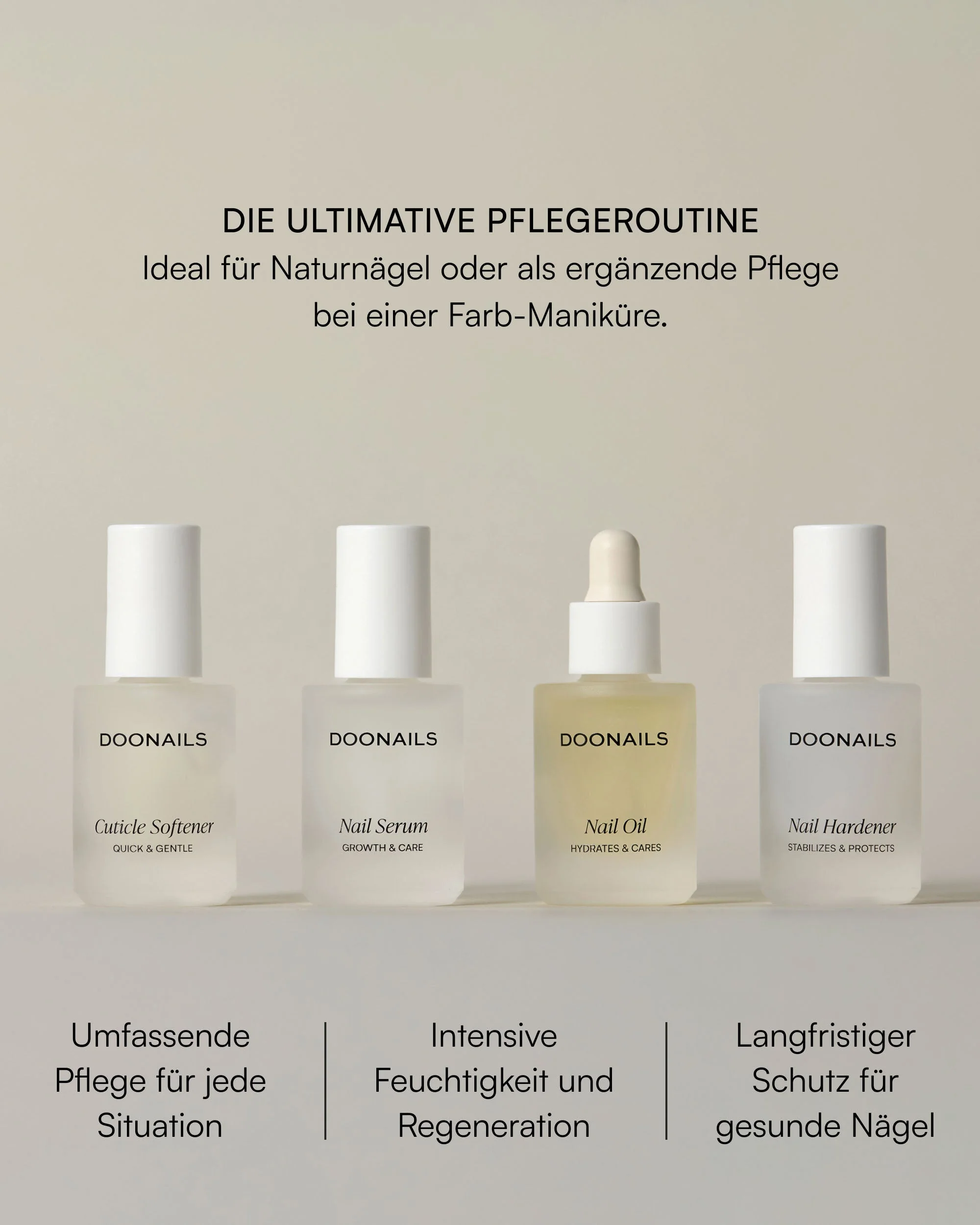 Das Nagelpflege Set vereint alle vier Doonails Pflegeprodukte in einer perfekt aufeinander abgestimmten Kombination. Dieses Set ist ideal für alle, die eine intensive, aber unkomplizierte Nagelpflegeroutine suchen, die sowohl Schutz als auch intensive Pflege bietet.