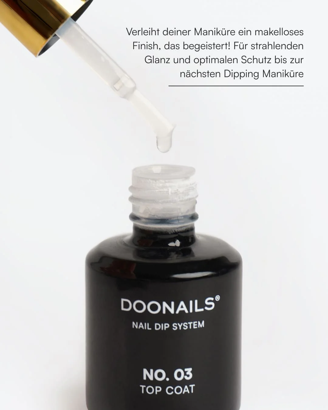 Der Doonails Top Coat ist der abschließende und ebenfalls ein unverzichtbarer Schritt jeder Dipping Powder Maniküre. Er versiegelt die bereits gehärteten Farbpuderschichten und schützt deine Nägel zuverlässig vor Abnutzung, Kratzern und Umwelteinflüssen – ganz ohne UV LED Lampe.